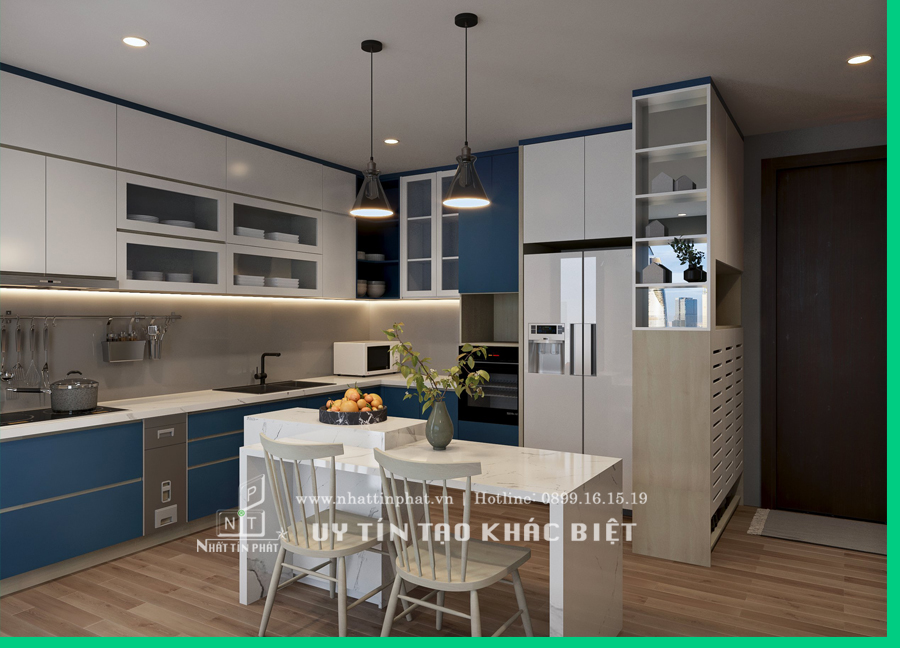 Đây là mẫu tủ bếp gỗ Acrylc được chúng tôi thiết kế tại căn hộ cao cấp ở quận 2, TP.Hồ Chí Minh. Mẫu tủ bếp được bố trí trong không gian nhà bếp, phòng khách liên thông với nhau. KTS chúng tôi đã sử dụng 2 tông màu : Trắng cho tủ trên và xanh cho hệ tủ bếp dưới. Ngoài ra việc sử dụng bàn đảo kết hợp bàn ăn cũng là một điểm nhấn cho không gian tủ bếp. Bàn đảo bếp tích hợp bàn ăn là một lựa chọn hợp lý cho căn hộ ít thành viên sinh sống.