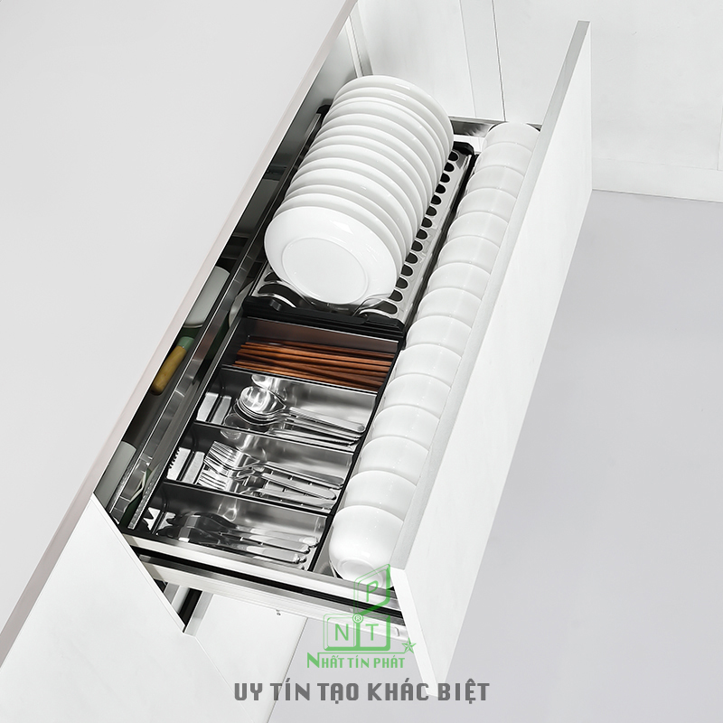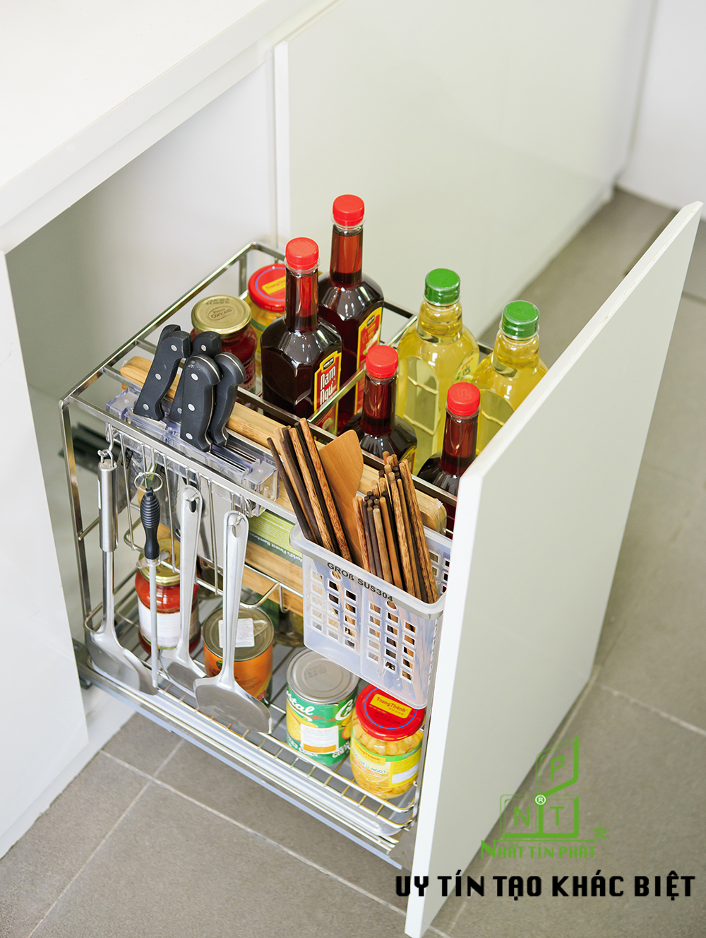Tủ bếp được bố trí thiết kế tích hợp một số phụ kiện inox giúp tối ưu không gian lưu trữ như : Kệ chén đĩa cho tủ trên, kệ chén và kệ xoong nồi cho tủ dưới, kệ gia vị dao thớt, kệ góc 1/2, thùng rác, và kệ chai lọ xà phòng dưới bồn rửa chén…