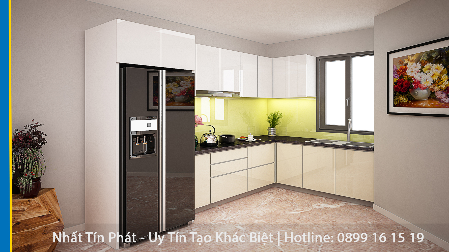 Tủ bếp được thiết kế theo hình dạng chữ L, Chị Thu yêu cầu chúng tôi bố trí không gian bếp đơn gian, không cầu kỳ để làm cho không gian nhẹ nhàng hơn khi vào nấu nướng. Vì vậy chúng tôi đã lên ý tưởng 3D tủ bếp với hình dáng chữ L sử dụng màu vật liệu Acrylic bóng gương để làm sáng không gian nhà bếp.