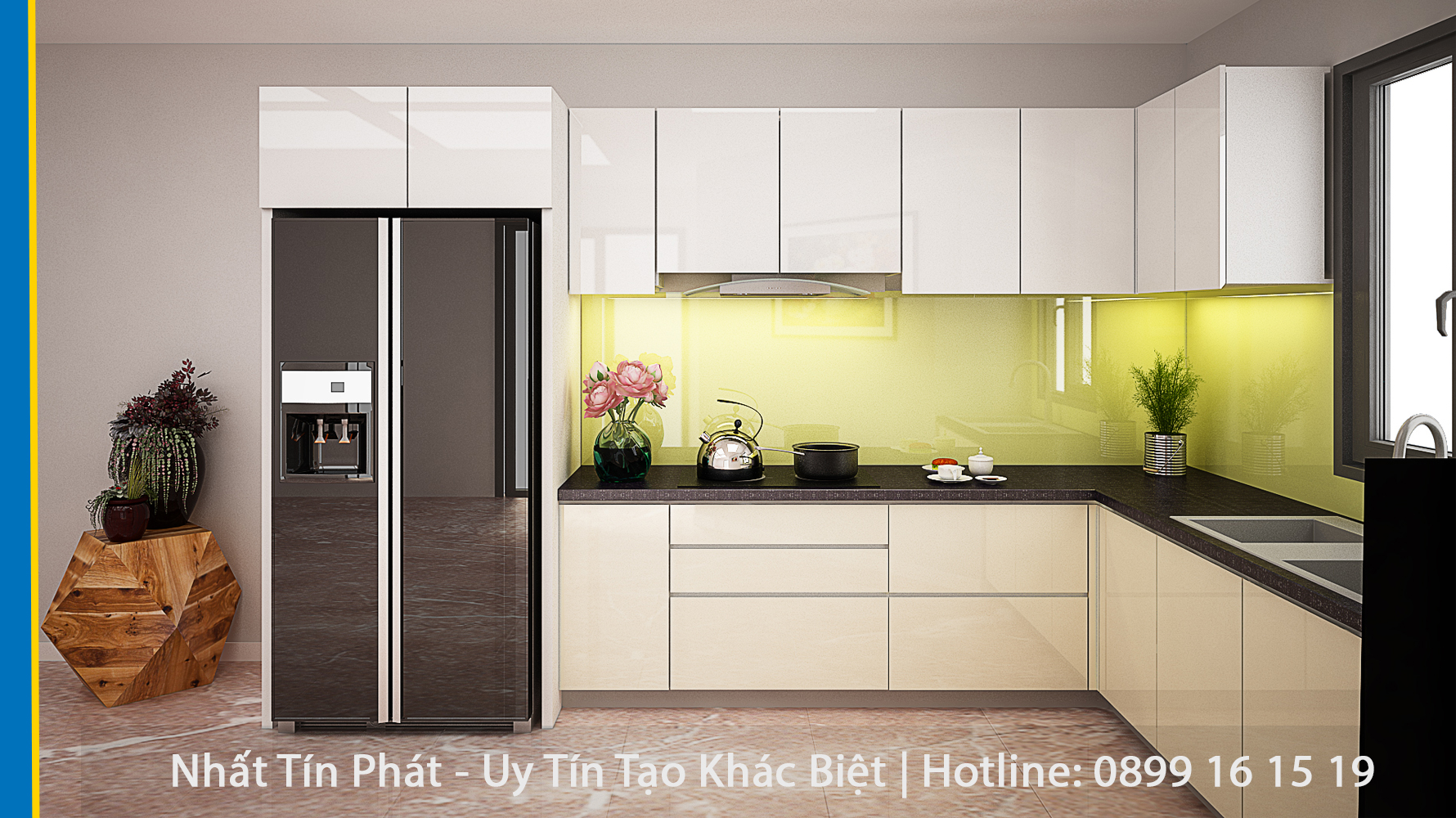 + Tủ bếp dưới: gỗ MDF An Cường chống ẩm phủ Acrylic bóng gương tone màu vàng kem.